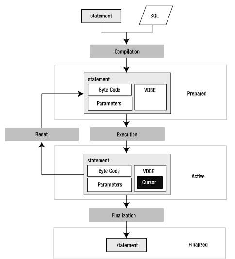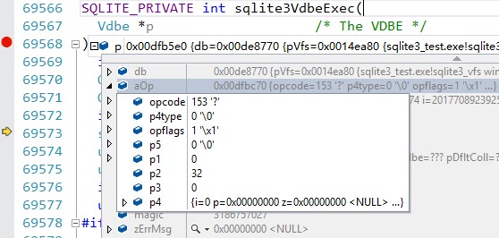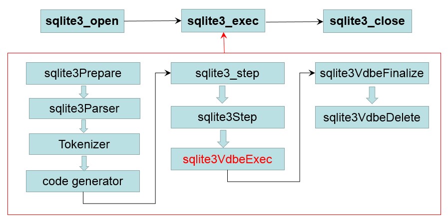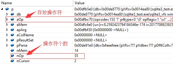 使用SQLite的C API函数可以对SQLite执行的过程有一个清晰的了解,就像SQLite结构图(图1-1)中一样,SQLite执行有三个大的步骤,具体过程如图3-1所示: SQLite首先创建或者打开一个数据库,然后执行相应的SQL语句,最后关闭数据库,这也是数据库操作的一般步骤。在执行SQL命令过程中,又分为了三个阶段,在Prepare阶段,输入的SQL语句通过分析器(parser),分词器(tokenizer)和代码生成器(code generator)编译成VDBE字节码。传入sqlite3VdbeExec函数的Vdbe类型指针变量p中,已经包含了所有需要执行的操作码(如图3-2)。p中的aOp的官方解释为:Space to hold the virtual machine‘s program,根据图3-3可以看出,aOp是存放操作符的空间。 在执行阶段,虚拟机执行操作符,执行过程是一个步进的过程,每一步都是由sqlite3_step函数启动,并由sqlite3VdbeExec函数执行由Prepare阶段编译的操作符。在Final阶段,先是执行sqlite3VdbeFinalize函数关闭VDBE,然后执行sqlite_finalize()函数结束SQLite的执行。通过下图3-4可以更容易理 解这个过程。