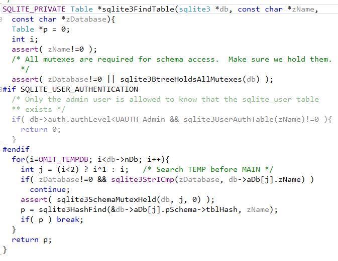 上图的红色方框是用来查找名为zName的表,进入此函数(如下图),功能是检测数据库是否已经存在相同的表。