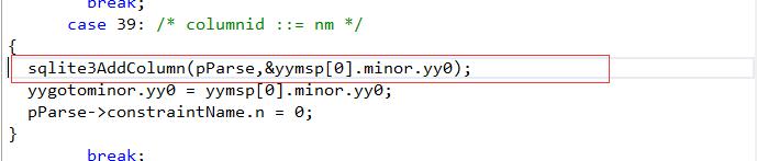 对新增加的一列添加属性,在使用函数sqlite3AddDefaultValue(Parse pParse, ExprSpan pSpan)添加默认值。通过函数void sqlite3AddPrimaryKey(