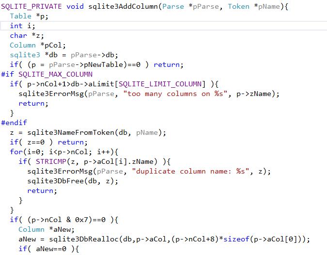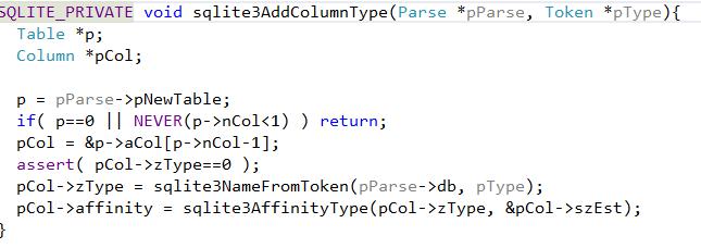 对新增加的一列进行默认操作,使用p->nCol++对列的总数进行修改(+1)。接着使用函数进行为空检查。使用函数sqlite3AddColumnType(Parse pParse, Token pType)