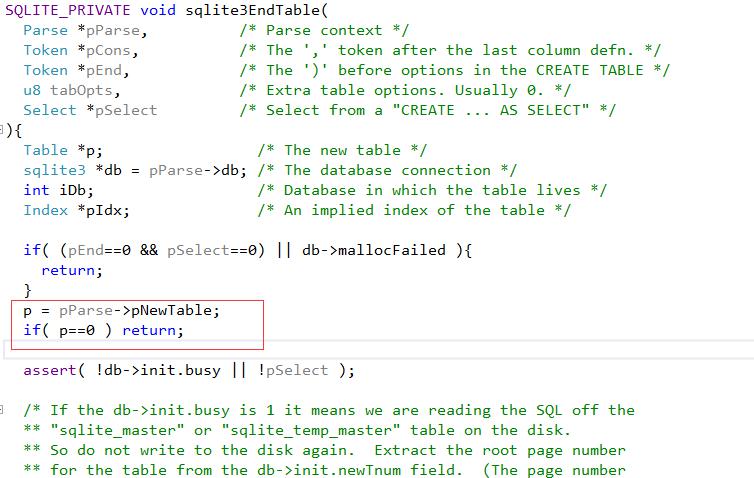 Sqlite3FindDb(db,pName1)完成此函数返回上一层函数sqlite3TwoPartName(pParse, pName1, pName2, &pName)中,完成后再返回上一级函数sqlite3StartTable中,继续执行。
