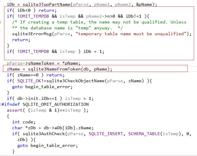 上图第一个红色方框中是对数据库的一些判断,判断数据库是否存在,是否为临时的。第二个红色方框是把token类型的pName转化为字符串(sqlite3NameFromToken()进入次函数如下图)。