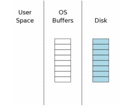 当一个数据库第一次打开时计算机的状态示意图如右图所示。图中最右边(“Disk”标注)表示保存在存储设备中的内容。每个方框代表一个扇区。蓝色的块表示这个扇区保存了原始资料。图中中间区域是操作系统的磁盘缓冲区。 在我们的案例开始的时候,这些缓存是还没有被使用—因此这些方框是空白的。图中左边区域显示 SQLite 用户进程的内存。因为这个数据库联 接刚刚打开,所以还没有任何数据记录被读入,所以这些内存也是空的。 (2)申请一个共享锁