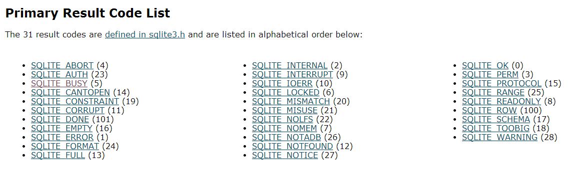 31个结果代码在sqlite3.h定义,按照字母顺序列出: