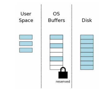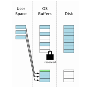 当一个数据库第一次打开时计算机的状态示意图如右图所示。图中最右边(“Disk”标注)表示保存在存储设备中的内容。每个方框代表一个扇区。蓝色的块表示这个扇区保存了原始资料。图中中间区域是操作系统的磁盘缓冲区。