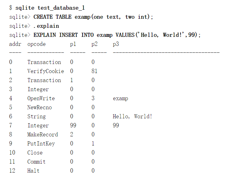 上图是一个SQL语句在通过命令成成的字节码指令。在指令中可以看到Transaction指令表示开始一个事务,Commit或Rollback结束一个事务,VerifyCookie检验数据库模式的版本等等。 OpenWrite指令在P1(这儿为0)上即examp表上打开一个读写指针。