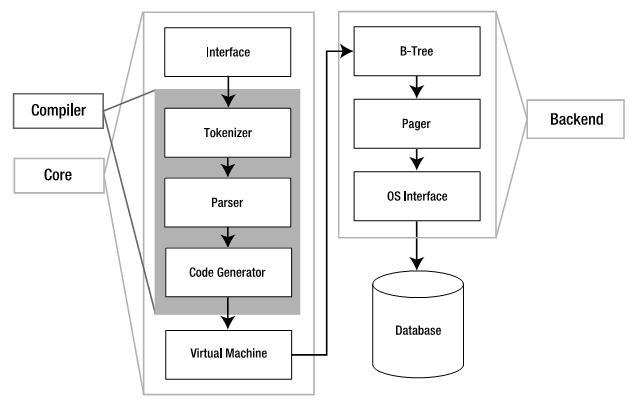 SQLite被分为如图所示的三个子系统中的八个大模块,在体系结构的顶部编译SQL语句,在中部执行,在底部处理存储于操作系统接口。接口由SQLite C API组成,也就是说不管是程序、脚本语言还是库文件,最终都是通过它与SQLite交互的(我们通常用得较多的ODBC/JDBC最后也会转化为相应C API的调用)。SQLite有自己的printf实现(带一些扩展功能),在printf.c中,还有自己的随机数生成器,在random.c中。