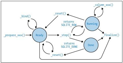 对于有些API函数,只能在某条语句处于特定状态下才可以执行,比如sqlite3_bind_xxx函数,只有在一条语句处于“ready”状态时才可以被调用,否则函数将会返回SQLITE_MISUSE错误码。下图展示了一条语句所处于的不同状态,以及不同状态之间是如何转换的。