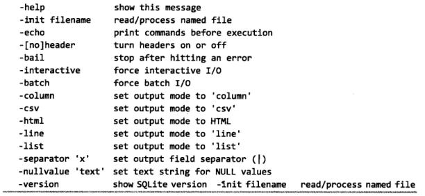 除了init是指定SQL命令的批处理文件外,绝大部分选项控制输出格式化。数据库文件名是必需的。SQL命令是可选的。