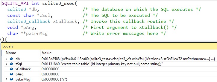 在代码中我们可以看到几个重要的API函数的调用(sqlite3_open、sqlite3_exec、sqlite3_close),sqlite3_exec函数执行我们输入的SQL语句,这些语句包括表的创建和表数据的增删查改,下面就是我们 的调试过程: