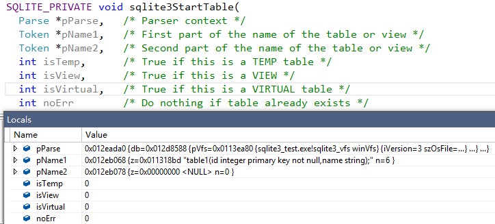 从图中我们可以看到表名table1已经在pName1中,虚表、视图和临时表标识都为0,pParse中保存着被分析解释过的SQL语句。sqlite3StartTable函数的功能就是创建表,在函数体中通过调用sqlite3FindTable函数在main数据库中查找到这个表,然后创建了一个VDBE实例v,把OP_ReadCookie、OP_If、OP_Integer、OP_SetCookie、OP_CreateTable、OP_OpenWrite、OP_NewRowid、OP_Null、OP_Insert、OP_Close等然后执行sqlite3FinishCoding函数,并在sqlite3FinishCoding函数中创建了一个VDBE实例v,把操作符OP_Init、OP_Transaction、OP_TableLock、OP_Goto和OP_Halt添加到了v的aOp中,到此为止准备阶段结束,释放占用内存,清除各种结构,代码也从sqlite3_prepare_v2跳出。